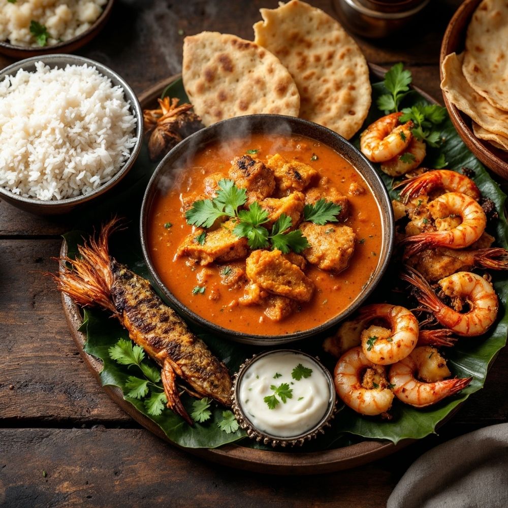 (fish-curry, scampi, one vegetable dish, raita, chapati and rice – mixed mild to hot)
