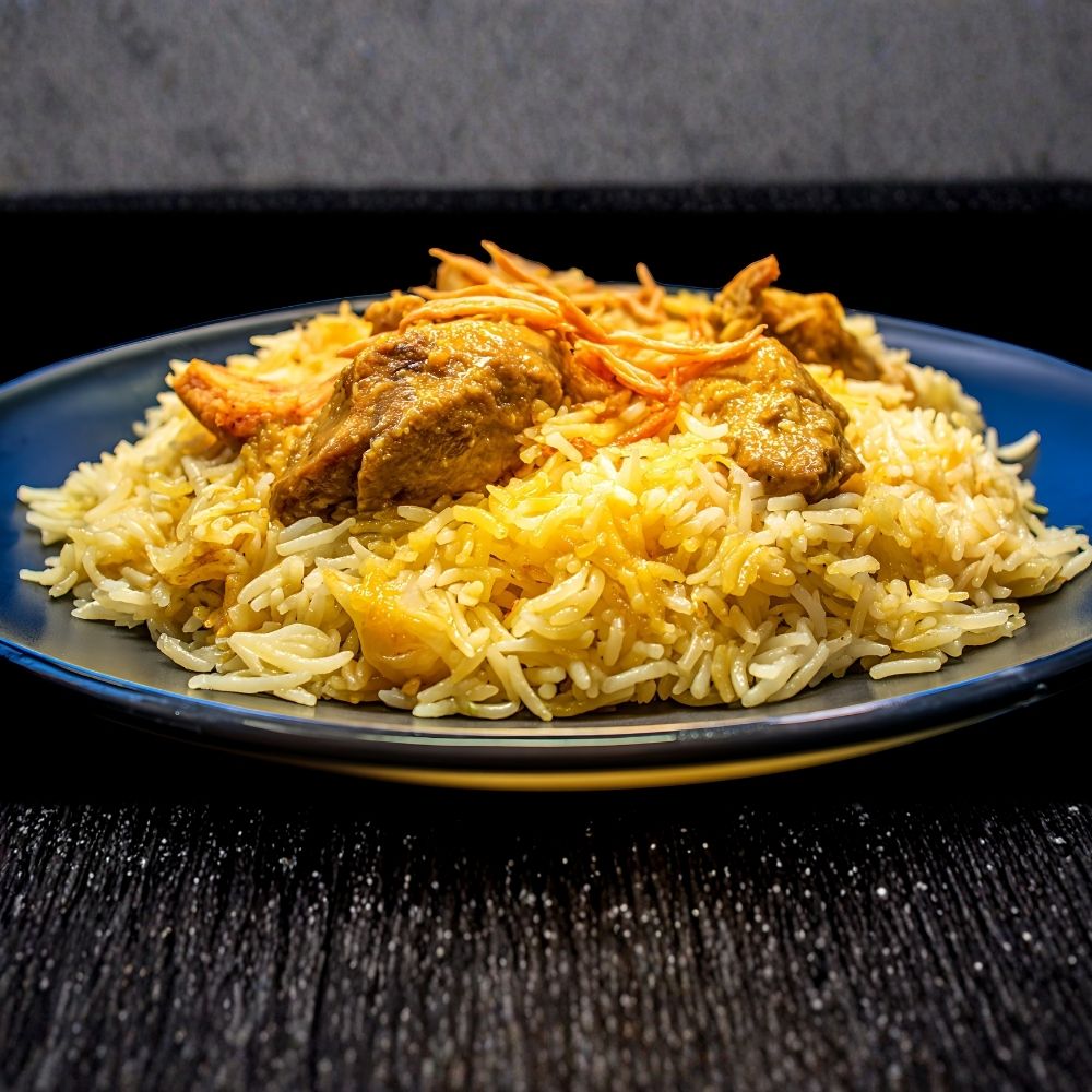 gebratenes Hähnchenbrustfilet mit Curryreis gemischt